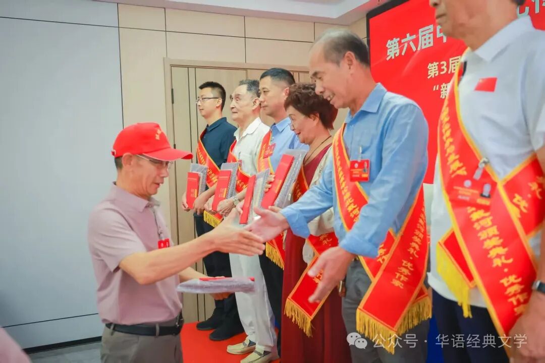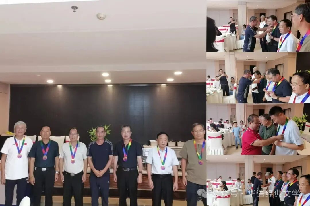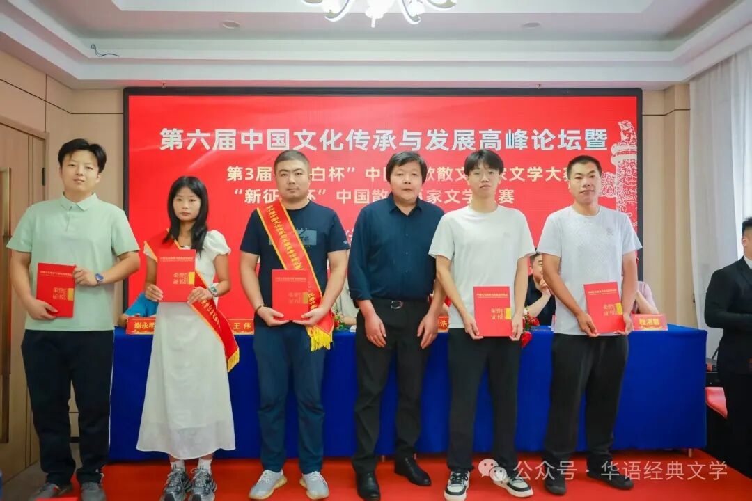 获奖作家:高平海、曲荣静、潘明珠(中国香港)、李虎、林居正、路金明领奖后合影